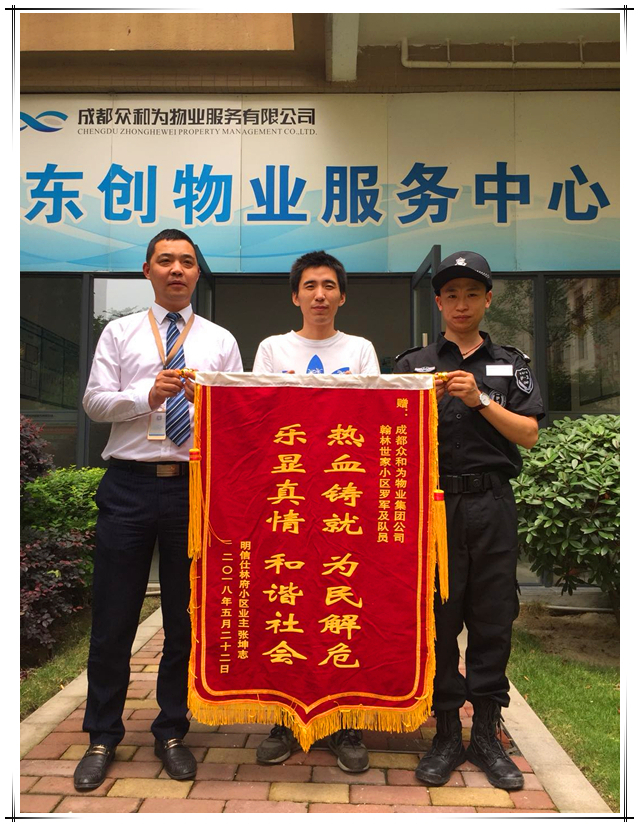 2018年5月24日下午14:00,张先生手将一面题有“热血铸就、为民解忧、乐显真情、和谐社会”的锦旗送到了东创物业客服中心,表达对物业工作人员的感谢。