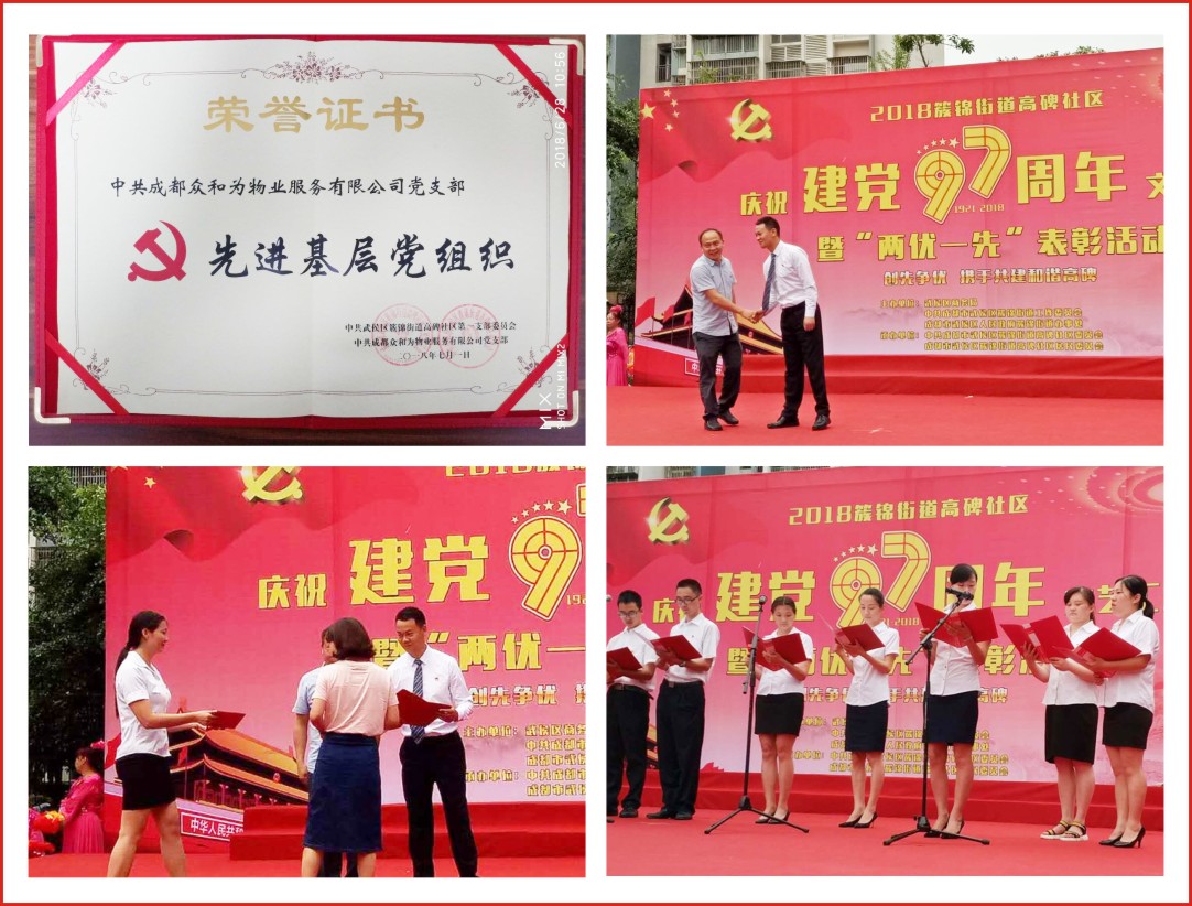 2018年6月28日,众和为党支部参加了簇锦街道高碑社区庆祝建党97周年文艺汇演暨“两优一先”表彰活动,活动上党支部成员重温了入党誓词,与高碑社区党委一起为党的诞辰献上了诗歌朗诵《七一颂歌》,荣获了先进基层党组织称号,受到了武侯区商务局领导、高碑社区"两委"的表彰。