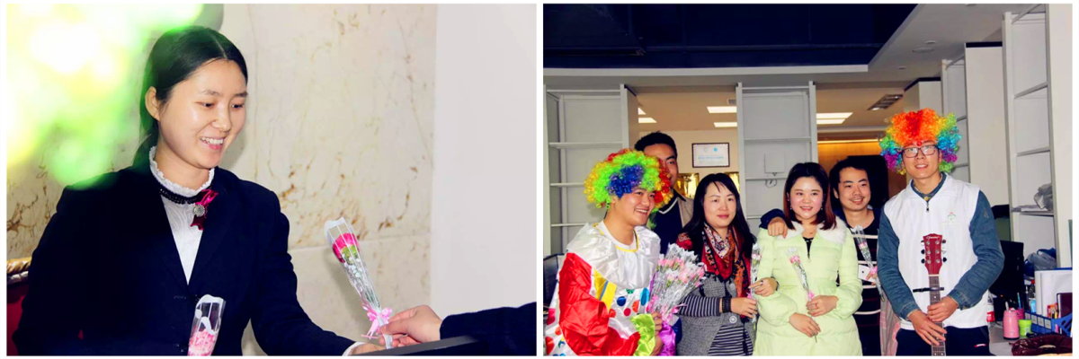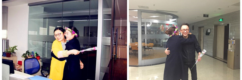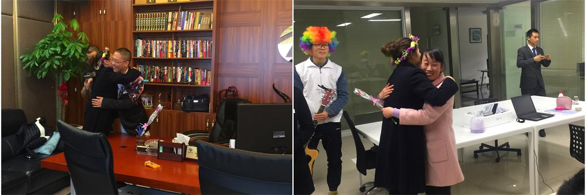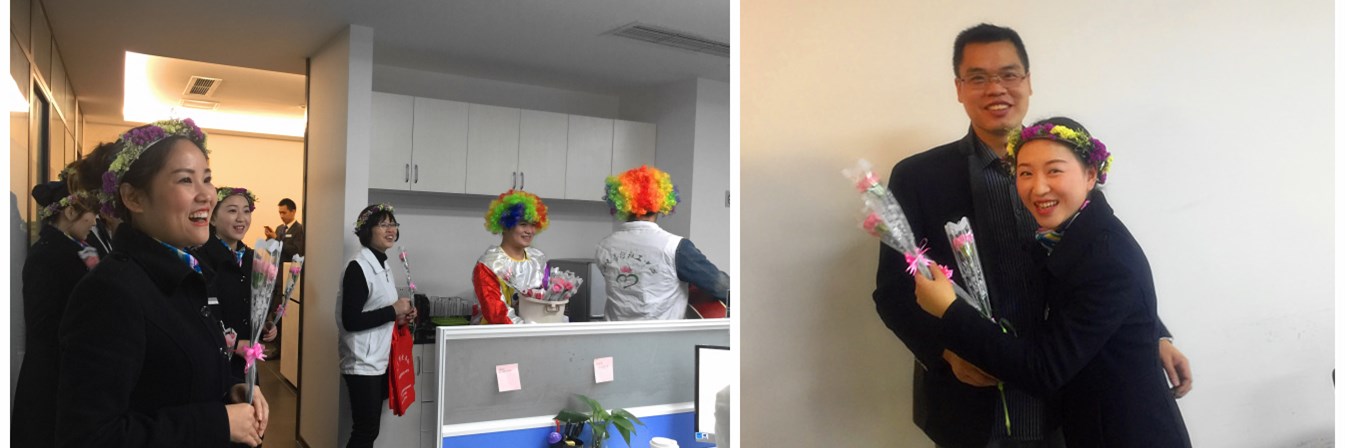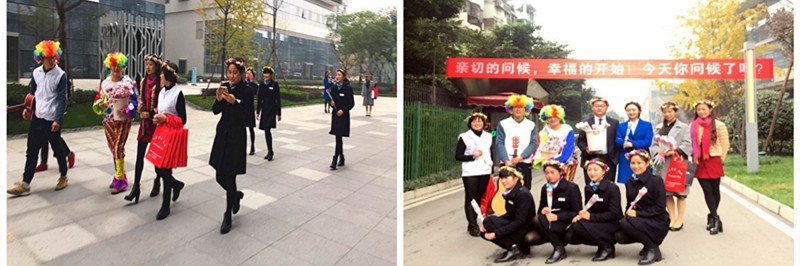 下午2点,所有准备工作就绪,众和为客服人员头戴花环,川音学子手拿吉他,“小丑”手捧鲜花,所有现场参与人员在大合仓楼下集结出发。当我们出现在忙碌工作中的业主们面前时,从他们的脸上看到了大大的惊喜,我司客服人员洋溢着笑容,给在场的每一位都送出了鲜花和拥抱。